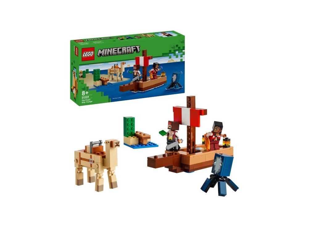 „Plavba na pirátské lodi (21259) je dobrodružná stavebnice z řady LEGO® Minecraft®. Stavitelé si s ní mohou hrát samostatně nebo ji zkombinovat s dalšími stavebnicemi (prodávají se samostatně) pro ještě zábavnější zážitek ze hry. Tato všestranná stavebnice pirátské lodi potěší každého fanoušky Minecraftu od 8 let a děti, které mají rády lodě a stavění. Tato dobrodružná pirátská stavebnice LEGO Minecraft obsahuje sestavitelnou loď, oliheň, velblouda, 2 figurky pirátů a doplňky. Tato speciální stavebnice LEGO s piráty, lodí a vůbec prvním dospělým velbloudem v řadě LEGO Minecraft potěší každého fanouška Minecraftu. Na dvojité sedadlo velblouda se vejdou oba piráti, kteří spolu vyrazí na další dobrodružství. Doplňky včetně ryby, mapy, železného meče a kaktusu podněcují nápadité hraní. Stavebnici lze kombinovat s dalšími sadami LEGO Minecraft (prodávají se samostatně) pro ještě více herních možností.“
