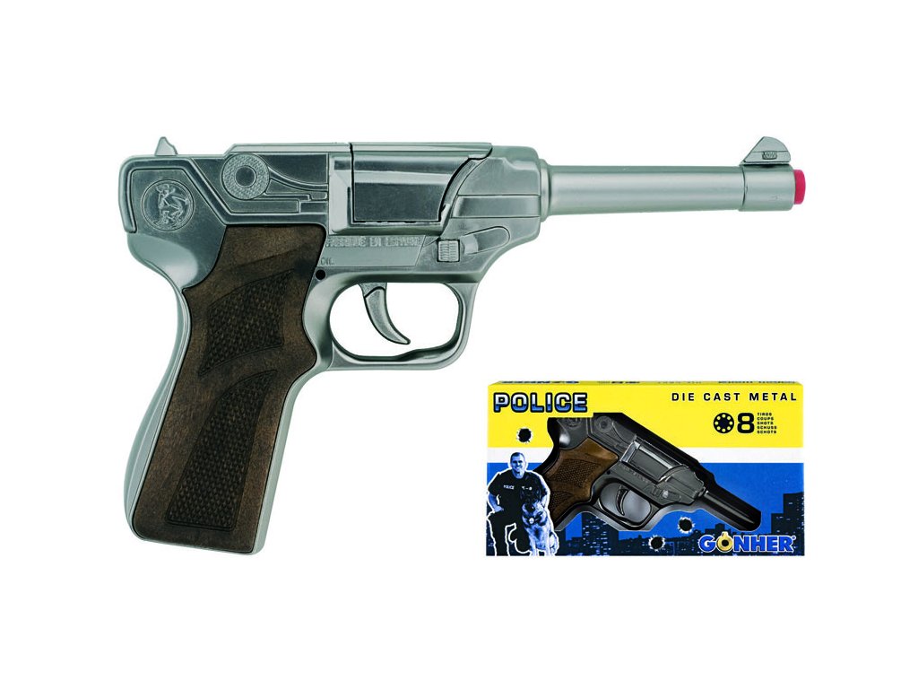 Policejní pistole kovová, stříbrná – na kapsíky – osm ran. Velikost pistole 19,5×11,5 cm. Vyrobeno ve Španělsku