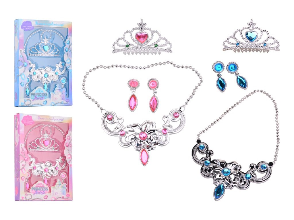 Šperky pro princezny Princess Secret – růžové/modré. Sada obsahuje čelenku, naušnice a náhrdelník .