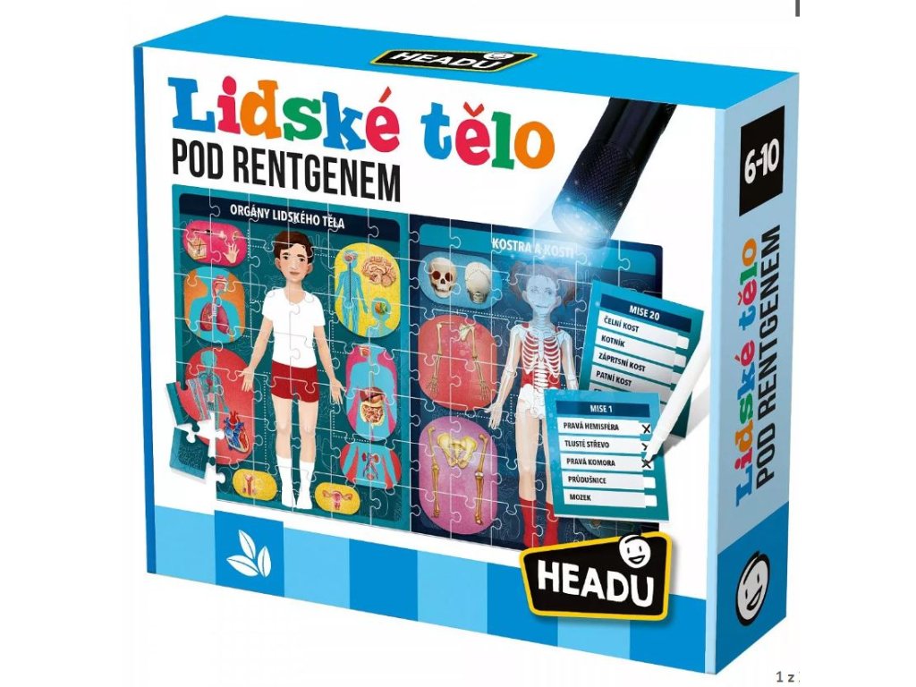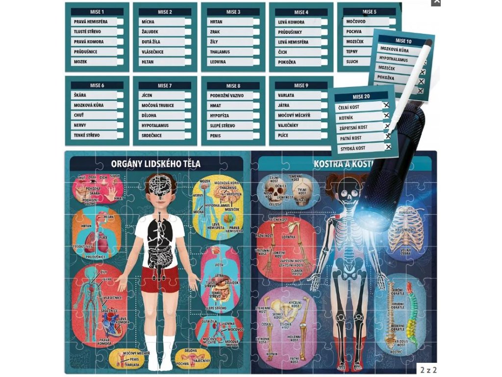 Hra s plněním misí. Sestavte toto velké puzzle a prostudujte obrázek, který jste sestavili. Objevte fascinující vlastnosti lidského těla, podívejte se na úžasné detaily důležitých orgánů, systémů, kostí a mnoha dalšího. Dokončete misi a sledujte to, co není vidět pouhým okem, ale jen za pomoci kouzelné baterky. Tato hra pomáhá dětem pochopit, že lidské tělo je složitá struktura tvořená různými systémy, orgány a částmi, které umožňují našemu tělu vykonávat určité funkce. Rozvoj dovedností: Znalost lidského těla - funkcí těla a životně důležitých orgánů · Aparát a systémy · Pozorovací a vědecká metoda · Pozornost a soustředění Obsah balení: 84 dílkové puzzle, 10 oboustranných karet misí, 1 mazatelné pero, 1 UV baterka (vyžadující 3 AAA baterie, které nejsou vložené)