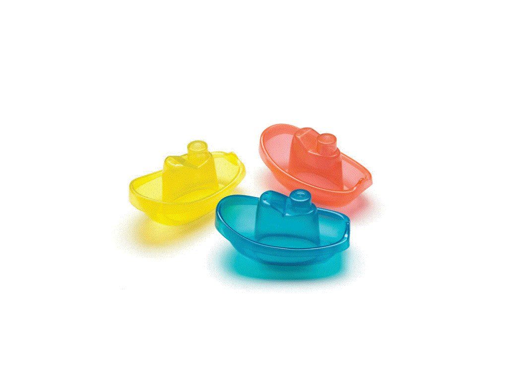 Barevné lodičky jsou vyrobeny z lehkého plastu a mají ideální tvar a velikost pro dětskou ručku. Každý malý odpůrce koupání si vodu zamiluje, když je uvidí na hladině. Parníčky lze skládat na sebe a nebo nechat protékat vodu malými otvory v kajutě.Vyrobeno z nezávadného materiálu.Věk 6 měs +
