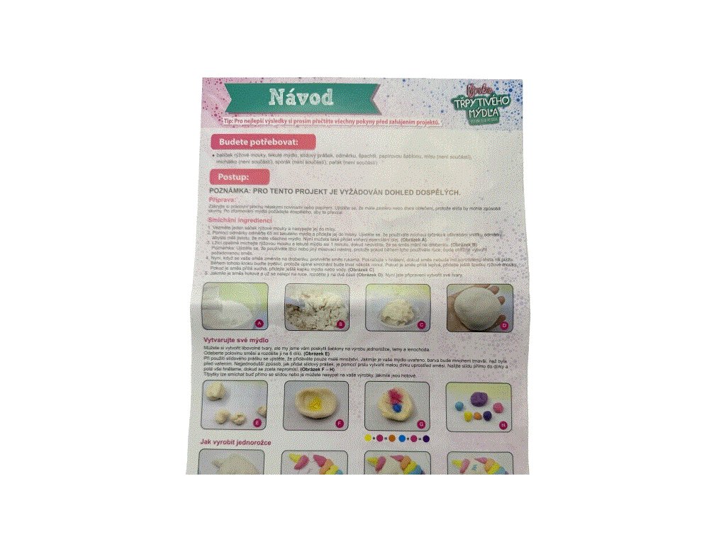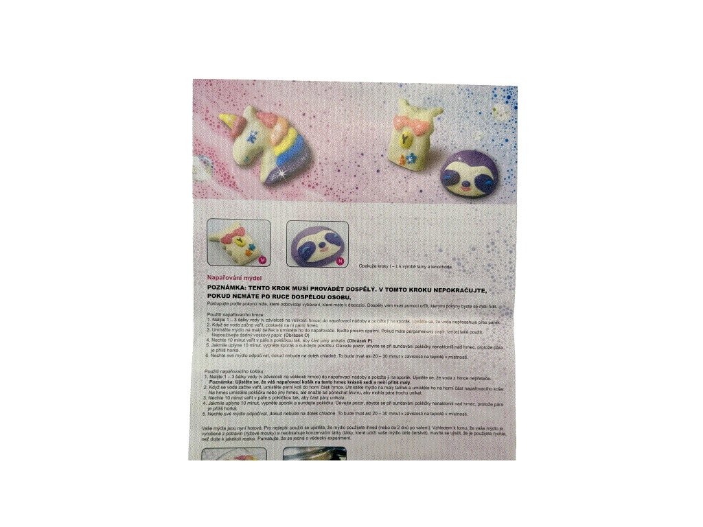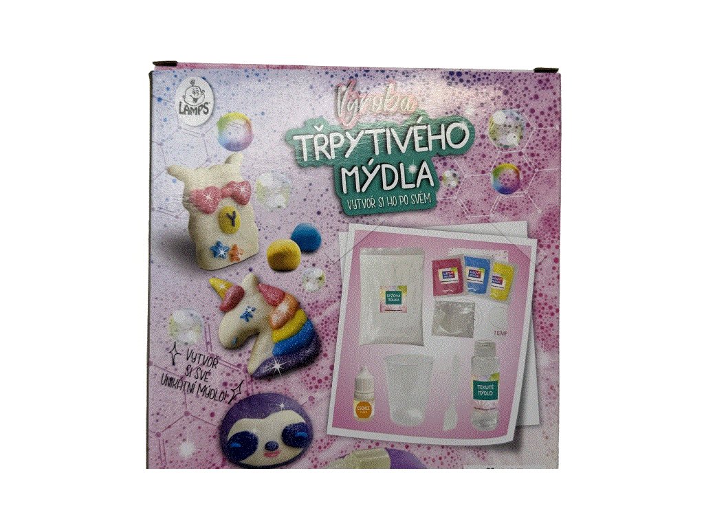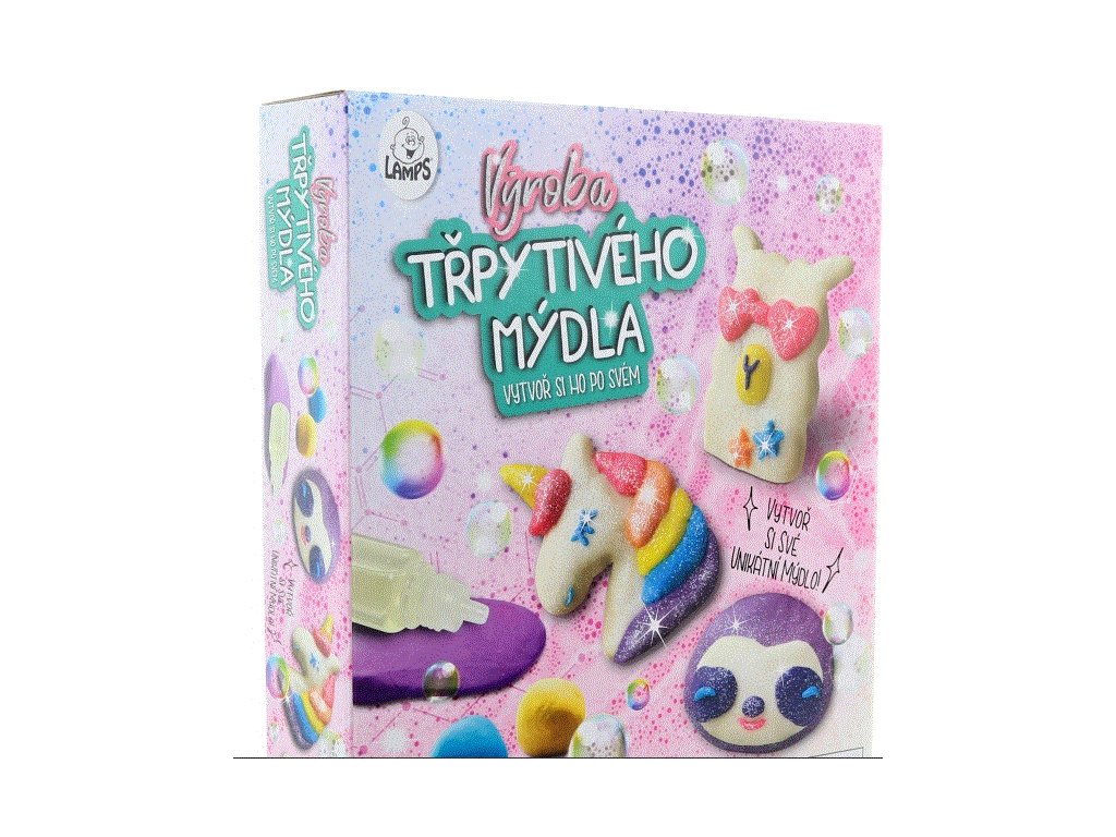 S touto sadou si můžete vyrobit krásná barevná mýdla v různých tvarech. Balení obsahuje vše potřebné: rýžovou mouku, tekuté mýdlo, odměřovací kelímek, lžíci, slidový prášek, esenci, třpytky, papirovou desku a návod. Velikost balení 20 x 23 x 5 cm. Doporučený věk 3+