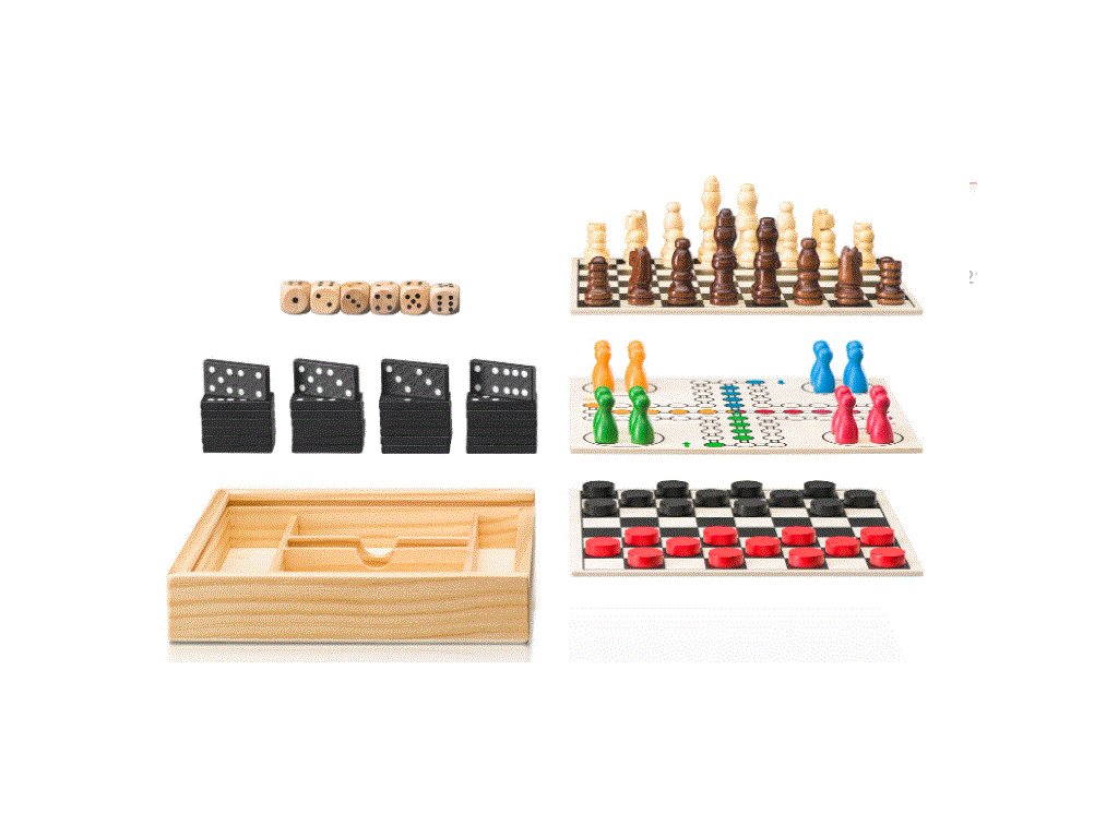 Soubor stolních her v dřevěném boxu, jehož víko tvoří oboustranná hrací deska pro jednotlivé společenské hry (šachy, dáma, člověče, nezlob se). Ke každé společenské hře najdete i příslušné figurky a hrací kosty. Součástí setu jsou i hrací kameny domina a sada hracích kostek. Magnetické provedení tohoto setu rozšiřuje jeho využitelnost i pro dlouhé cesty autem, vlakem či letadlem. | Věk: 3+| Rozměr: 18,5 × 18,5 × 4 cm