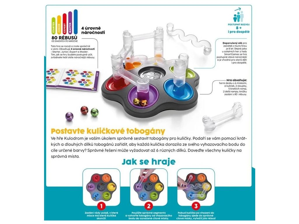 Postavte kuličkové tobogány. Ve hře Kulodrom je vaším úkolem správně sestavit tobogány pro kuličky. Podaří se vám pomocí krátkých a dlouhých dílků tobogánů zařídit, aby každá kulička dorazila ze svého vyhazovacího bodu do cíle určené barvy? Správné řešení může vyžadovat až 6 různých dílků. Doveďte všechny kuličky na správná místa. Určeno pro 1 hráče. Věk 8+