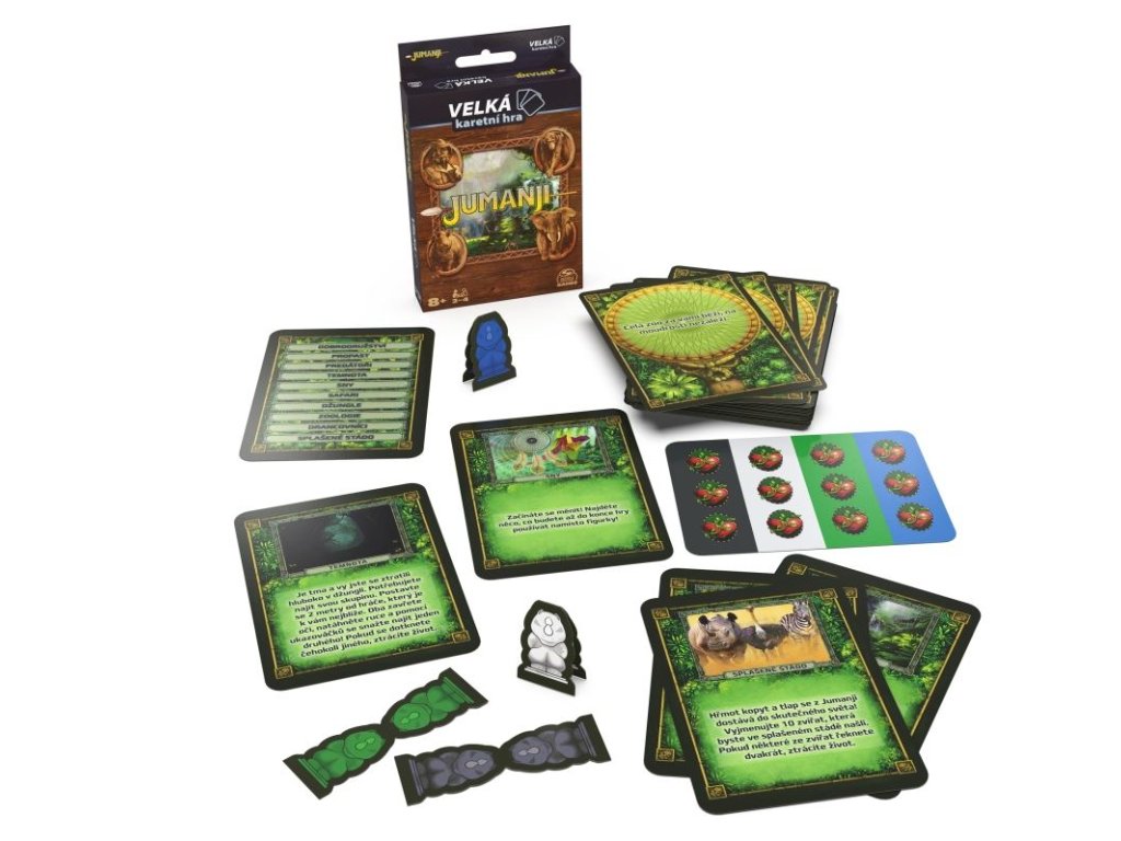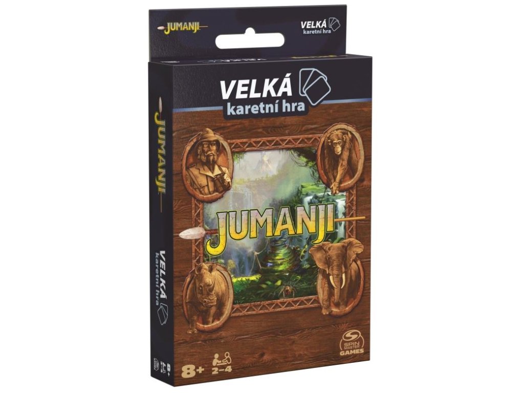 Nezačínejte hrát, pokud nechcete hru dohrát! S karetní hrou Jumanji budete moct se svými kolegy dobrodruhy vyrazit na výpravu džunglí plnou řešení hádanek a plnění výzev, zatímco se všichni budete snažit přežít! Tuto karetní hru je snadné připravit a začít hrát. Vylámejte hrací postavičky, složte je do tvaru stanu a umístěte je na pole pro sledovaní životů na jejich odpovídající barvu. Takto bude mít každý hráč přehled o svých životech. Hra je ideální pro milovníky kultovního filmu Jumanji, ať už dávají přednost tomu s Robinem Williamsem nebo Dwaynem Johnsonem. Položte referenční kartu hádanky lícem nahoru před všechny hráče a výzvu zamíchejte. Dostaňte se přes 10 výzev a ujistěte se, že všichni přežijí! Chceš-li poznat nový svět... pusť se do hry právě teď. Tuto společenskou hru lze hrát jako deskovku pro 2 až 4 hráče. Na věku nezáleží – s touto párty deskovkou se určitě při rodinném večeru pobaví dospělí, teenageři i děti ve věku 8 a více let! Klasický akční film Jumanji má tu nejlepší hru pro dospělé i pro děti. Je to skvělá hra na cesty, ale poslouží i jako žertovný dárek nebo dárek k narozeninám. Nebojte se... zahrát si karetní verzi Jumanji!