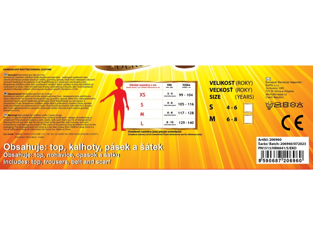 Karnevalový kostým pro opravdického piráta! Kostým ve velikosti S je určen pro chlapce ve věkovém rozmezí 4-6 let (105-116 cm). Pozor, balení obsahuje pásek, horní díl, kalhoty a šátek! Nejen letos je potřeba myslet EKO-nomicky i EKO-logicky! EKO-balení je vhodné zejména pro e-shopy kde zákazník nakupuje dle fotografie a není třeba velkého balení s věšákem. EKO-logicky – na balení bylo použito méně plastu a dalších materiálů. Jedná se o malý transparentní obal s fotografií. EKO-nomicky –EKO-obal zabere jen polovinu místa – šetřete skladová místa s námi!