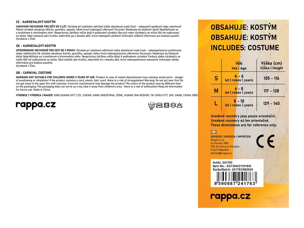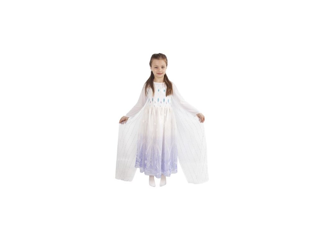 Úchvatný dívčí kostým pro všechny zimní princezny! Dlouhé šaty v bílé barvě jsou v horní části zdobené flitry, od pasu dolů je bílo-fialová tylová sukně zdobena potiskem. Součástí šatů je také vlečka dekorována flitry. Kostým ve velikosti S je určen pro holčičky ve věkovém rozmezí 4-6 let (110-116 cm).