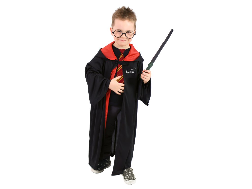 Dětský kouzelnický plášt s kapucí je určen pro všechny holky a kluky ve věkovém rozmezí 3-7 let (104-136 cm). Plášť černo-červené barvy se zapínáním u krku je na levé straně zdoben nápisem Kouzelník. Součástí kostýmu jsou brýle a kravata. Délka pláště cca 75 cm.