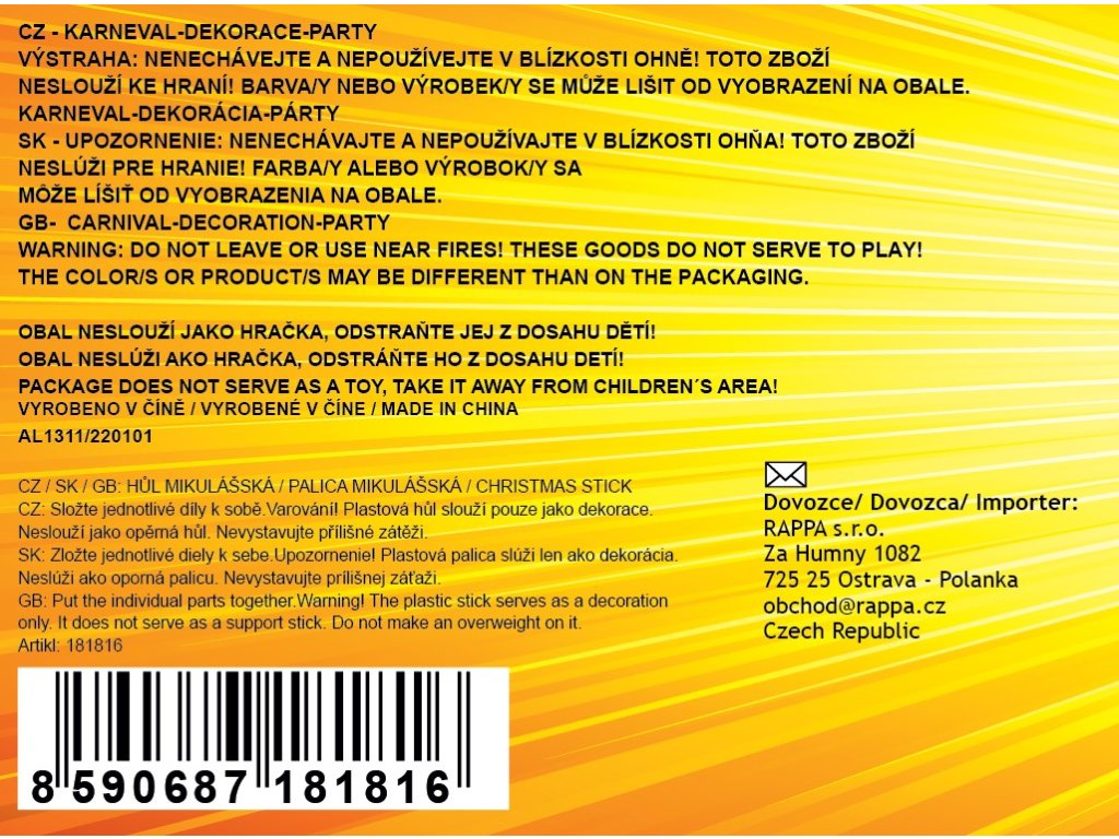 Mikulášská berle plastová zlatá, lze složit. Délka 193 cm, možnost zkrácení odebráním jednoho dílu na délku 166 cm. Perfektní doplněk ke kostýmu Mikuláše.