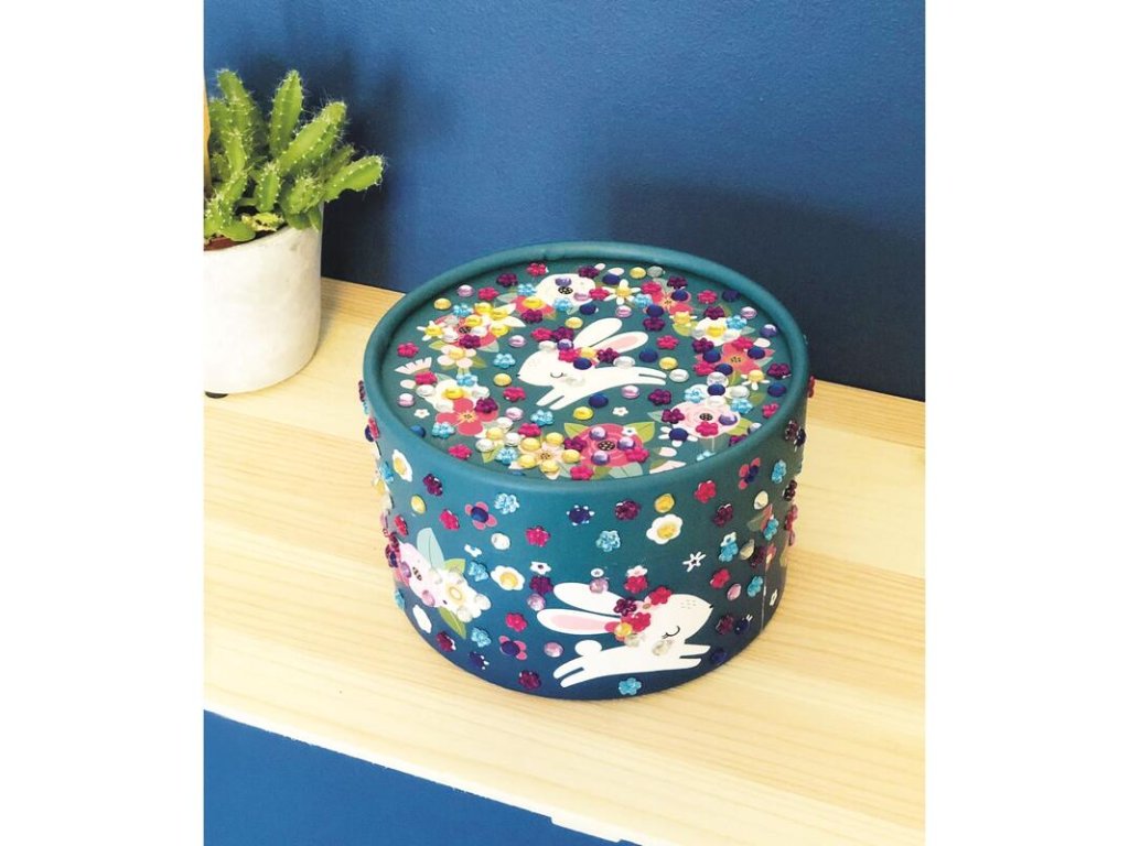 Ozdob si krásnou oválnou dózu na šperky nebo jiné poklady pomocí samolepících drahokamů na vyznačená místa.