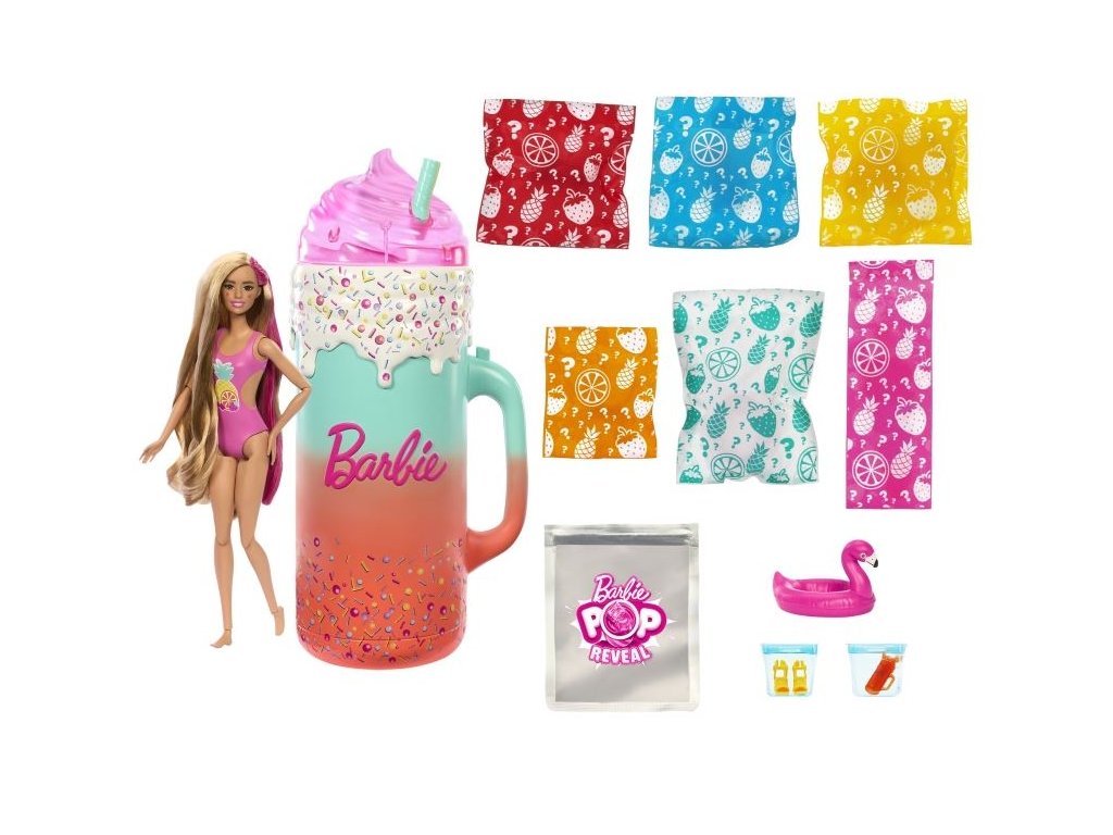 Dárkový set Barbie® Pop Reveal™ Deluxe šťavnaté ovoce překvapí panenkou a zábavnými módními doplňky a doplňky s ovocnou tematikou! Set obsahuje voňavou panenku, plyšové voňavé zvířátko, funkci změny barvy, tvarovatelný písek a více než 15 překvapení. Panenka neumí samostatně stát. Barvy a vzhled výrobku se mohou lišit. Věk 3+