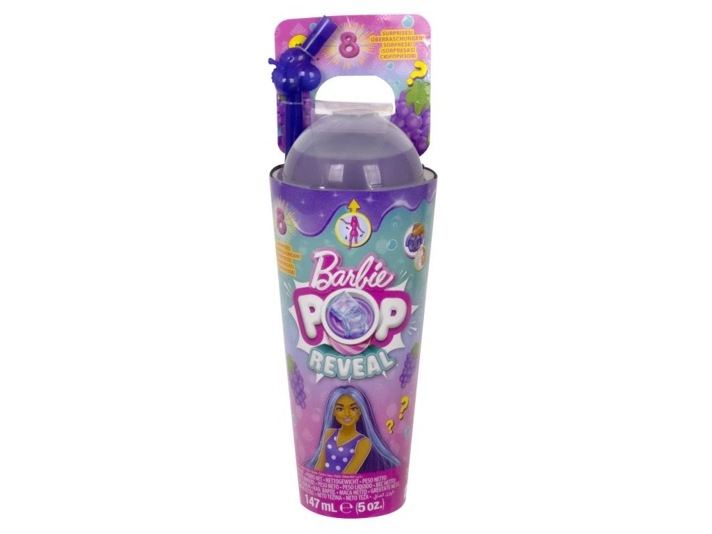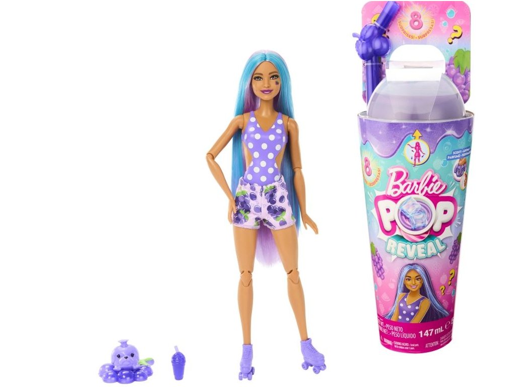 Panenka Barbie® Pop Reveal™ potěší děti tematikou šťavnatého ovoce a novým zážitkem při rozbalování, kdy pomocí slizu odhalí překvapení, mezi něž patří panenka Barbie® s vůní ovoce a kostky ledu, které při prasknutí odhalí další překvapení. Set obsahuje heboučké voňavé zvířátko, tematické doplňky a hru se změnou barev. Všechny čtyři panenky z edice Pop Reveal™ Šťavnaté ovoce se liší vzhledem, druhem ovoce a barevným provedením, a i s doplňky jsou skryté v limonádových kelímcích s víčkem. Panenky se prodávají zvlášť v závislosti na dostupnosti. Panenka nemůže stát samostatně. Barvy a provedení dekorací se mohou lišit. Věk 3+