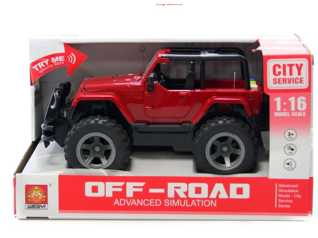 Plastový jeep na baterie (3X AG13) - jsou součástí balení. Auto po stisknutí tlačítek na střeše svítí a vydává zvuky. Má otevírací dveře. Rozměry auta cca 23 x 10 cm. Rozměry balení cca 27 x 16 x 14,5 cm. Věk 3+