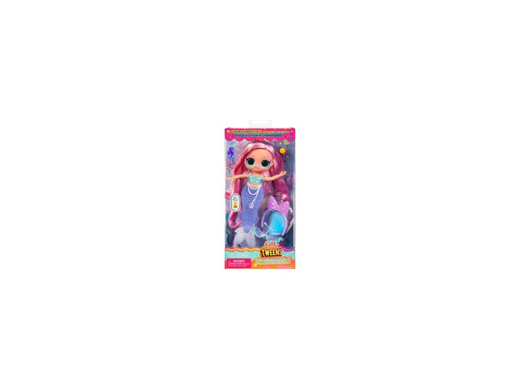 Představujeme 4 nové L.O.L. Surprise! Tweens rošťácké panenky, které se přeměnily na mořské panny s nádherně barevnou ploutví, která mění barvu, když ji ponoříš do ledové vody. Panenka dokáže na ploutvi stát. V balení najdeš spoustu tematických doplňků. Obsah balení: 1 panenka, 1 outfit, 3 doplňky. Velikost L.O.L. panenky: cca 16,5 cm. Věk 3+