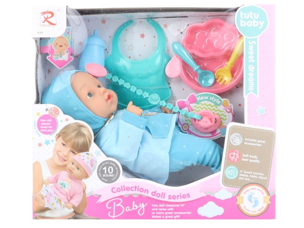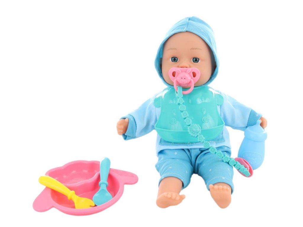 Miminko s doplňky. Panenka po vložení baterií vydává zvuky- 10 různých zvuků. Balení obsahuje také dudlík, plastový bryndáček, lahvičku, talířek a další doplňky. Napájení na 3 AG13 baterie (jsou součástí balení). Rozměry miminka 30 x 12 cm. Rozměry balení cca 33 x 29 x 11,5 cm. Věk 3+