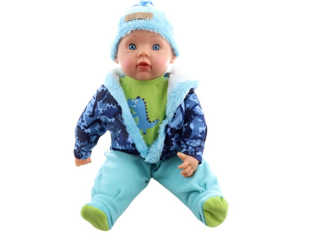 Panenka velká – miminko kluk – s měkkým tělem o velikosti cca 50 x 33 x 13 cm. Oblečení lze sundat. Materiál plast+polyester+výplň. Konce končetin a hlava jsou z plastu. Baleno v sáčku. Věk 3+