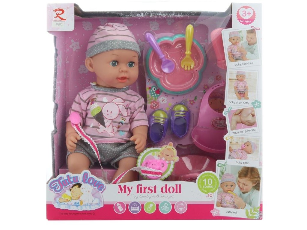 Miminko s doplňky. Panenka po vložení baterií vydává zvuky a čůrá. Balení obsahuje také botičky pro panenku, plastový bryndáček, lahvičku, talířek a další doplňky. Napájení na 3 AG13 baterie (jsou součástí balení). Rozměry miminka 32 x 14 cm. Rozměry balení cca 35 x 35 x 14,5 cm. Věk 3+