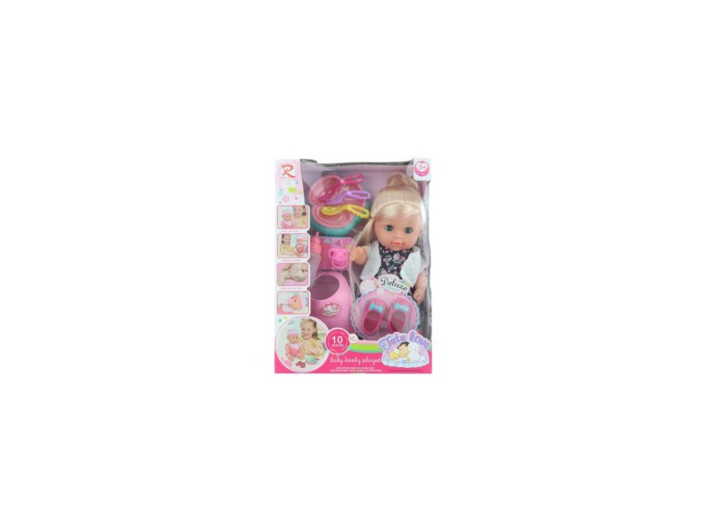 Panenka s doplňky. Panenka po vložení baterií vydává zvuky a čůrá. Balení obsahuje také botičky pro panenku, plastový bryndáček, lahvičku, talířek a další doplňky. Napájení na 3 AG13 baterie (jsou součástí balení). Rozměry panenky cca 27 x 11 cm. Rozměry balení cca 24 x 33 x 11 cm. Věk 3+