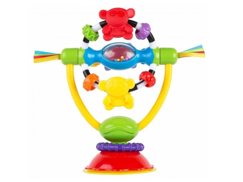 Již žádné drama při krmení!Tato aktivity hračka je dvě hračky v jedné. Pomůže vám zabavit dítě při krmení. Díky přísavce ji lehce pevně upevníte k hladkému povrchu židličky a zatímco batole objevuje co vše hračka umí, můžete jej snadno nakrmit. Vrchní část lze odejmout a použít při hře samostatně. Získáte tak dětské chrastítko. Vrchní část se otáčí a chrastí. Barevné opičky a kroužky lze posouvat. Uprostřed hračky je ukryté zrcátko pro hru na jukanou. Věk 6m+
