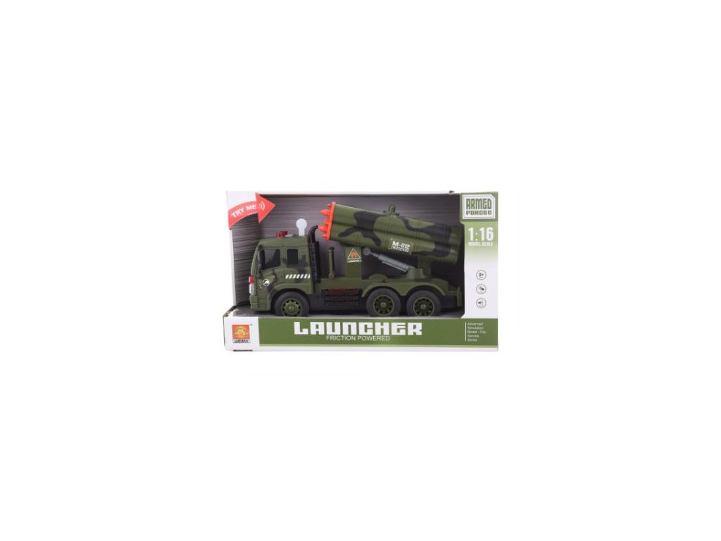 Vojenské auto s raketami na baterie, po stisknutí tlačítek vydává zvuky a svítí. Rozměr auta cca 25 x 14 cm. Rozměry balení cca 32 x 12 x 18,5 cm. Napájení 3x AG13 (jsou součástí). Věk 3+