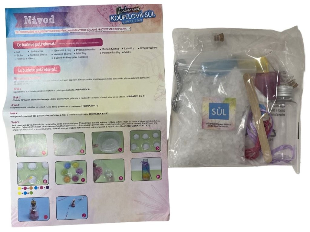 Kreativní sada výroba koupelové soli. Vytvořte si jedinečnou koupelovou sůl. Balení obsahuje sůl, jedlou sodu, esenciální olej, lahvičky, barevné prášky, míchací tyčinky, šroubovací oka, stříbrnou šňůrku, stuhu, voskovou šňůrku, mini filtry, plastové korálky a návod. Baleno v krabici. Rozměry balení 20x23x5 cm. Věk 3+