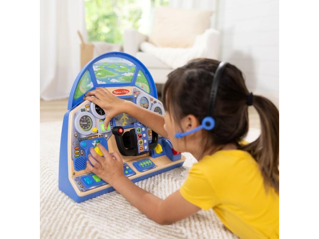 Světelné číselníky zahrnují výškoměr, horizont, kurz, rychlost letu; extra fidget spínače zaměstnávají prsty; podporuje rozvoj jemné motoriky, nápadité hry a jazykové dovednosti.
