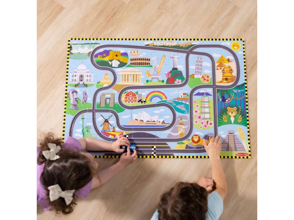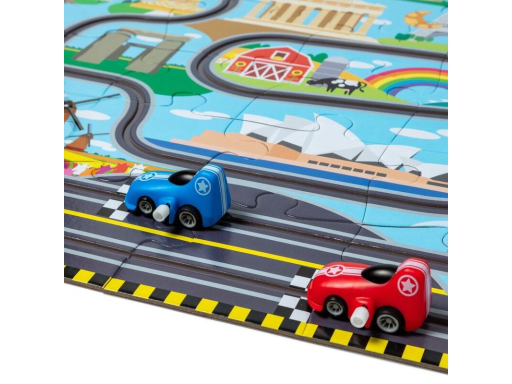 Spojte dohromady 48 kartonových dílků skládačky a vytvořte závodní dráhu, která vede přes některé z nejznámějších světových památek, drážky v kusech tvoří kroutící se, zatáčecí závodní dráhu pro 2 natahovací vozidla (nevyžadují baterie).