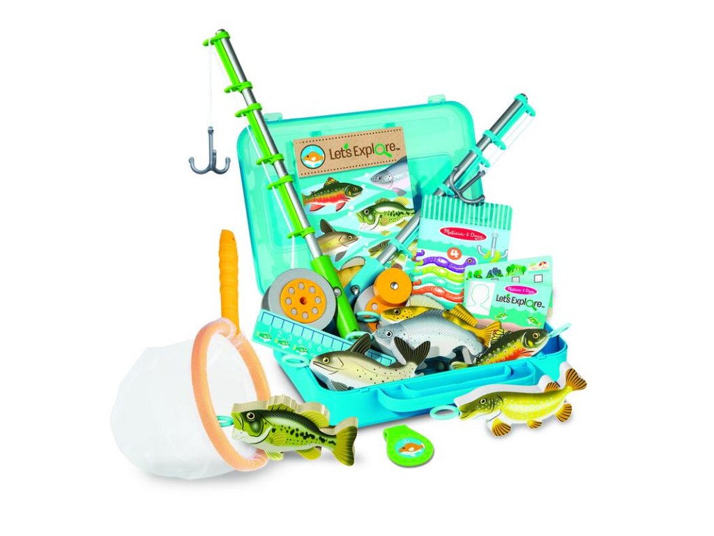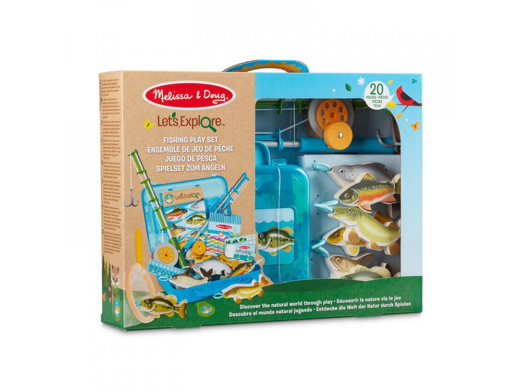 Prozkoumejte venkovní zážitek z rybaření s 21dílnou rybářskou herní sadou Melissa & Doug Let’s Explore™! Popadni dva dřevěné rybářské pruty, nastraž na háčky předstírané červy, pak zahákni a seber šest dřevěných ryb! Oboustranná hrací podložka umožňuje mladým rybářům vybrat si zimní nebo letní zážitek. Ilustrovaný rybářský průvodce pomáhá identifikovat druhy ryb, vysvětluje základy rybaření a obsahuje zábavné hry. Vše je uloženo v krabici na nářadí pro rychlé a snadné čištění.
