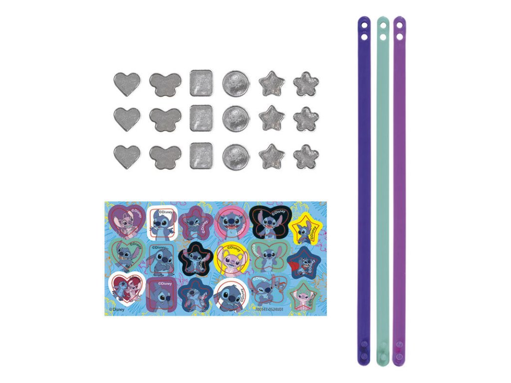 Balení obsahuje: tři náramky a 18 různých druhů doplňků s motivem Stitch.