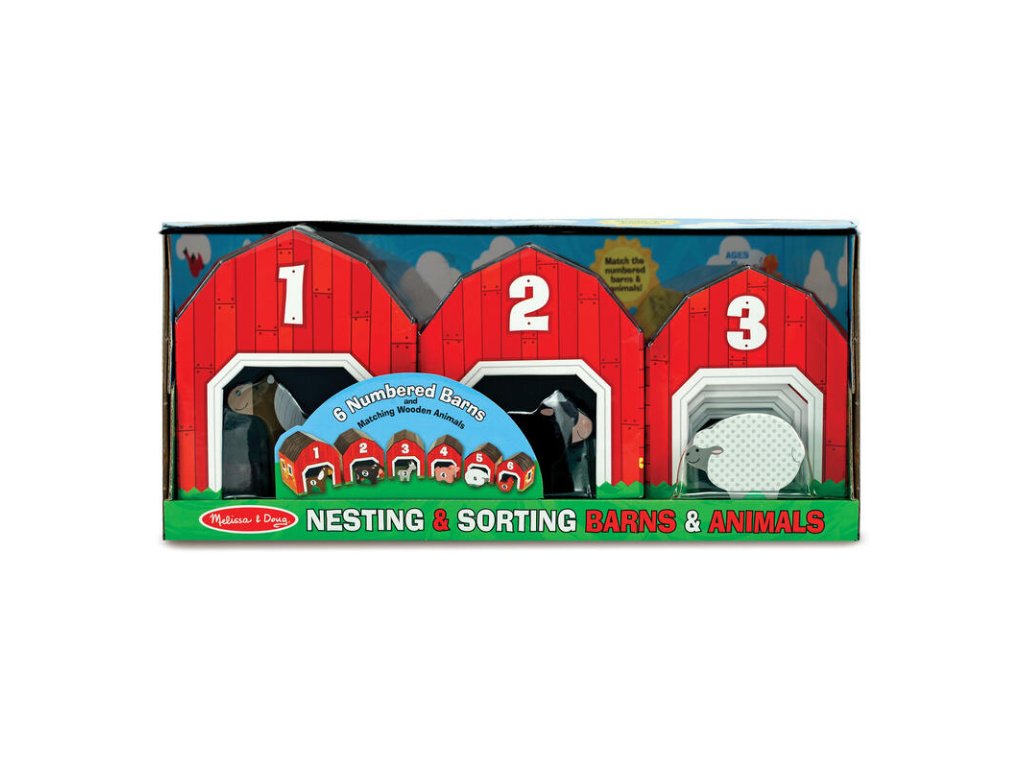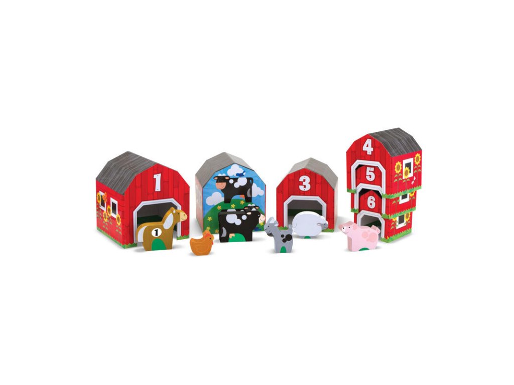 Šest stodol ke stavění, vkládání a řazení, ale i zapadající jeden do druhého a šest očíslovaných zvířat, která se vejdou dovnitř.