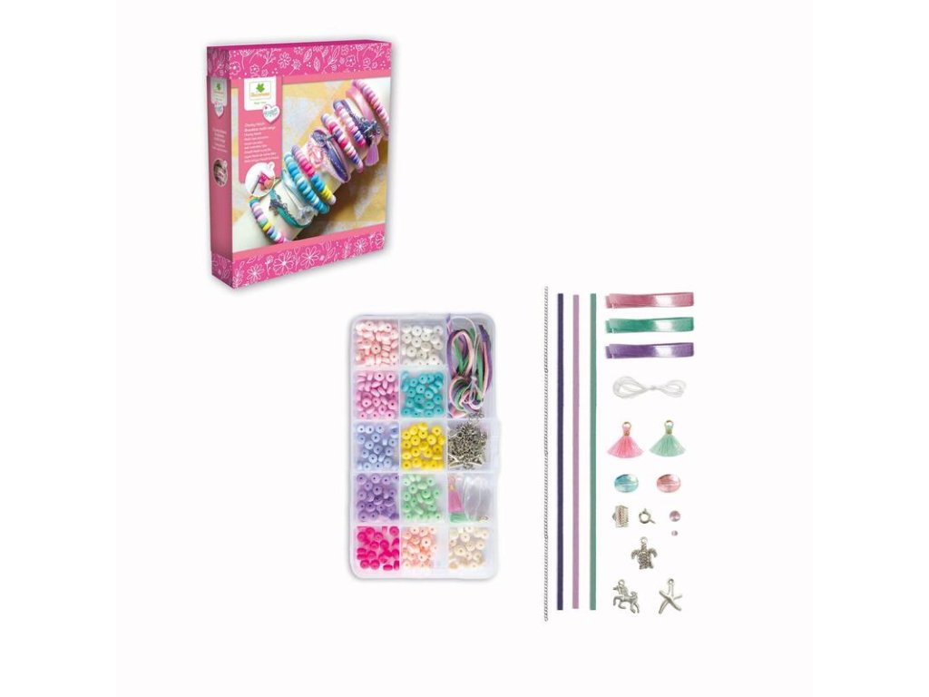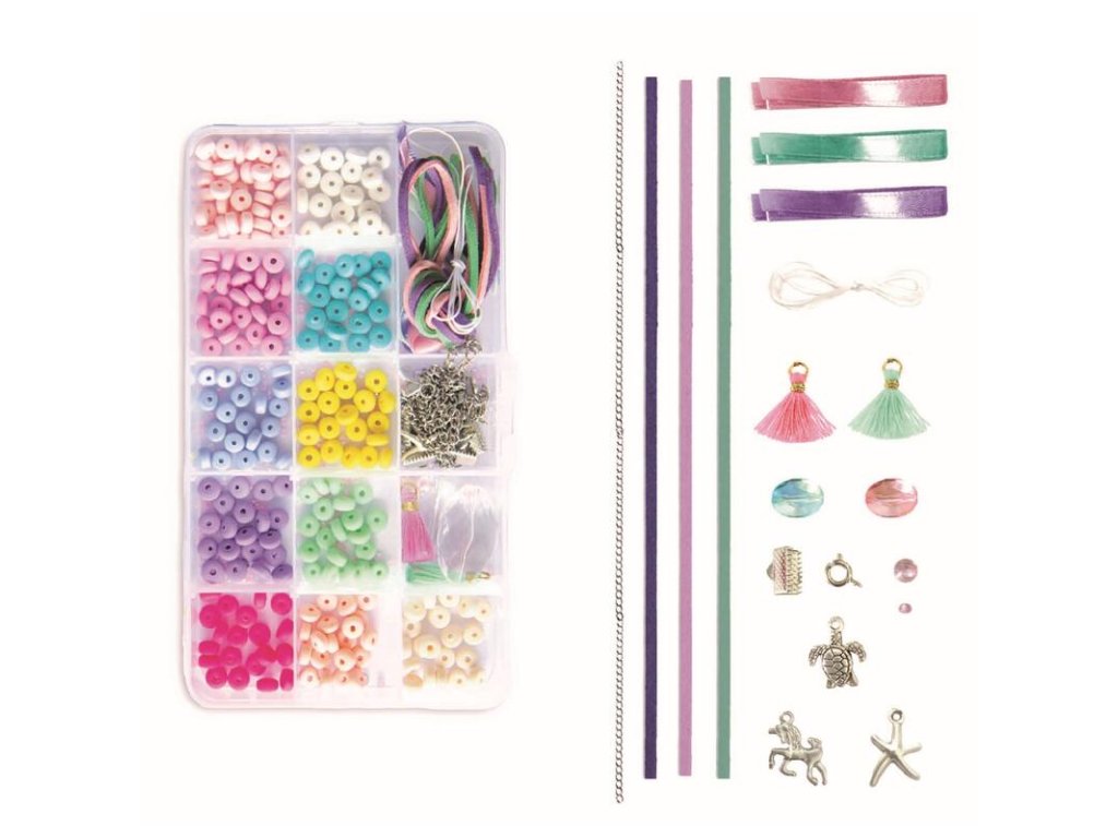 Balení obsahuje: heishi korálky, stuhy, přívěsky, bambulky, 6 spon, 15 kroužků, 10 velkých spon a návod.