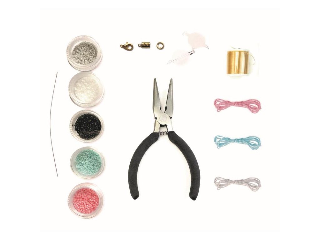 Balení obsahuje: japonské korálky 5 barev, kroužky, nylonovou nit na cívce zlaté barvy, 5 spon, šňůrky, jehlu a návod.