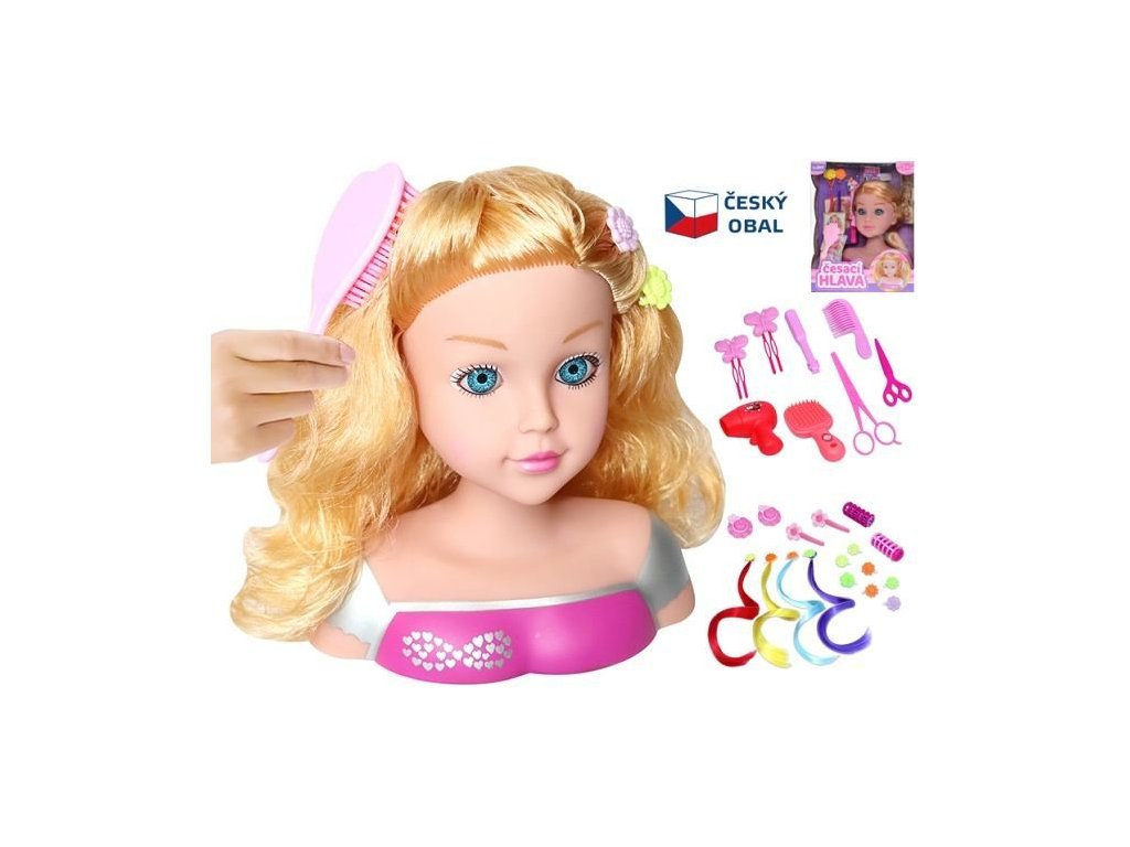 Česací hlava s příslušenstvím. Velikost 22 cm. Součástí hřeben, kulma, barevné prameny vlasů, sponky. Věk: 3+