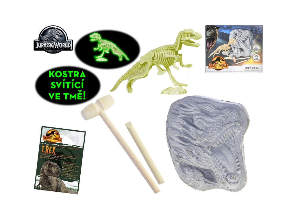 Jurský svět sada pro tesání kostry T-Rexe svítící ve tmě s doplňky v krabičce