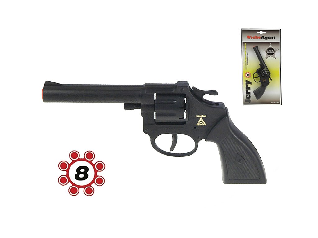 Kapslová pistole Jerry pro malé bojovníky a pistolníky. Zbraň je vyrobená z plastu a její velikost je 19 cm. Kapslovka je na kapsle 8 ran.