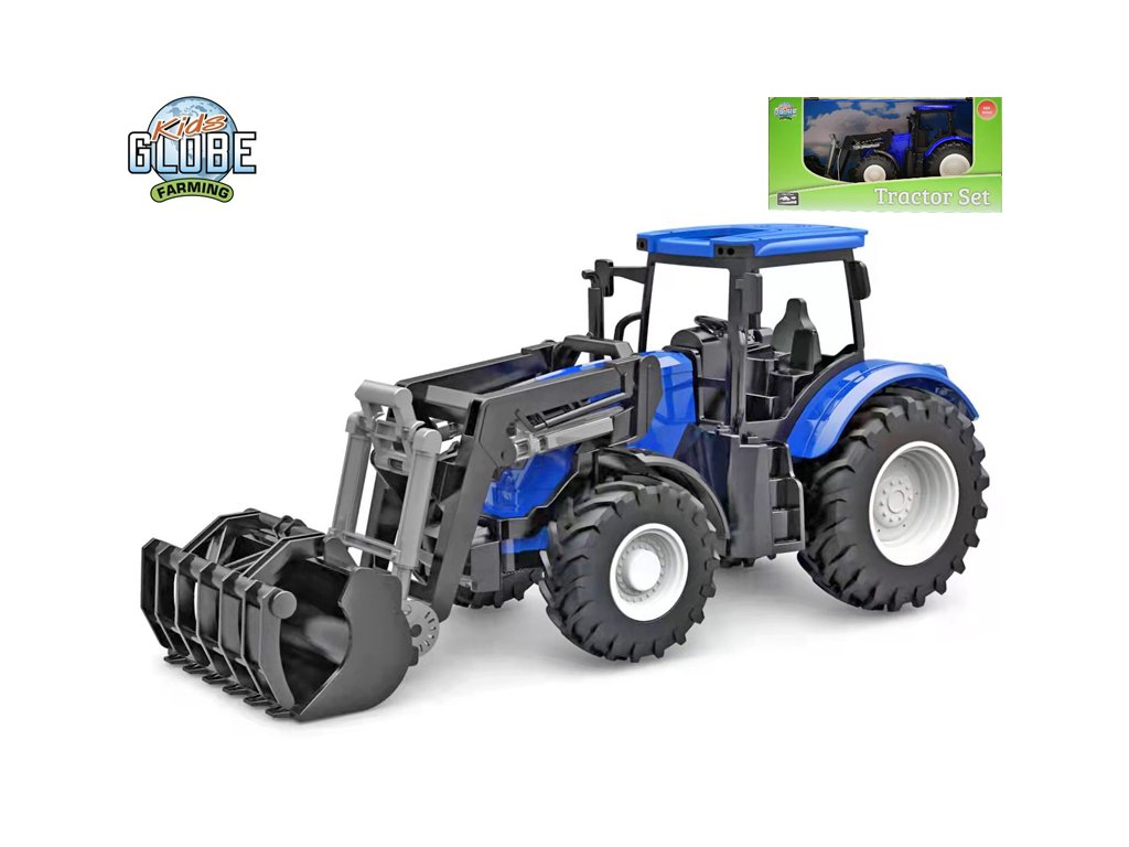 Kids Globe Farming traktor modrý s předním nakladačem volný chod 27cm v krabičce