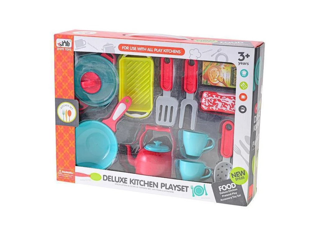 Obsah balení: konvice s víčkem, pánev, hrnec s poklicí, pekáč, hrníček 2ks, kuchyňské náčiní 3ks, makety potravin 2ks