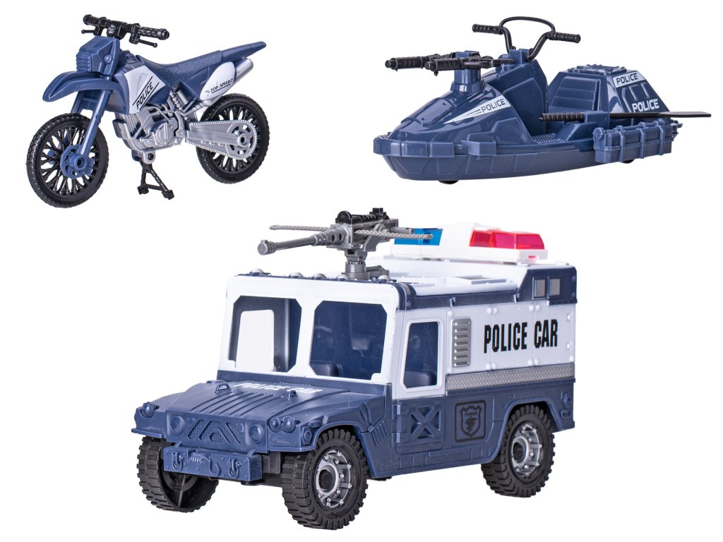 Policejní vozidla na volný chod. Součástí balení jsou různé nezbytné policejní doplňky.