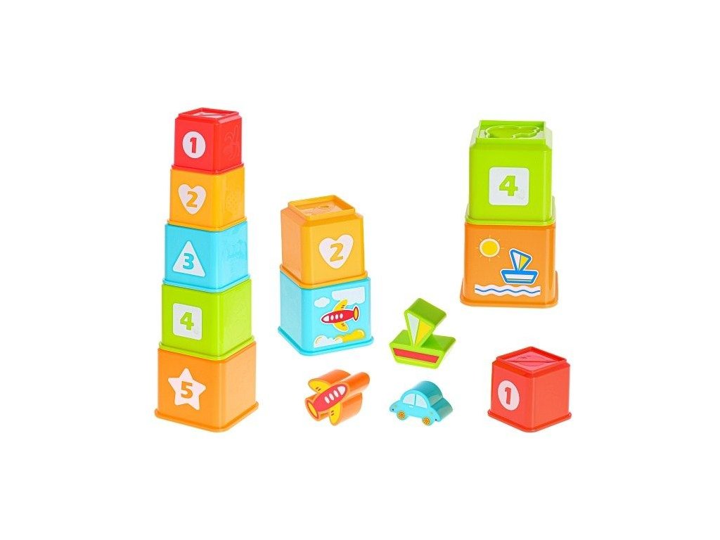 Na kostkách jsou vyobrazeny dopravní prostředky - letadlo, autíčko, raketa a lodička. Děti se při hraní naučí jak skládat kostky, tak barvy a počty. Rozvíjí koordinaci oko-ruka a celkově zručnost dětí. Balení obsahuje 5 skládacích kostek a 3 vkládačky. Skvělá hračka pro děti od 12 měsíců.