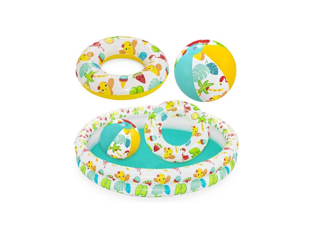 Pestrobarevný bazének Bestway 59460 Play Pool Set s letním motivem snadno vytáhne děti z domu venku na sluníčko. Jeho kvalita a odolnost je předem testována, tak aby vydržel různé dětské hry ve vodě. Tento nafukovací bazének je perfektním místem pro všechny děti starší 2 let, které si chtějí hrát ve vodě během letních veder. V balení naleznete také nafukovací míč a plovací kruh ve stejném designu jako bazének.