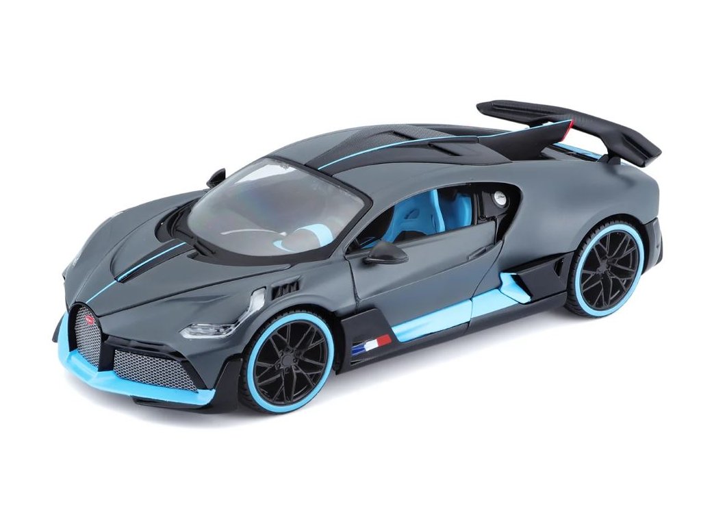 Bugatti Divo. Divo je nejlépe ovladatelný a nejdynamičtější vůz, jaký kdy Bugatti vyrobilo – pocta 110. výročí. Kovový model s plastovými doplňky v měřítku 1:24. Rozměry: 22,9x10,5x11,4cm. Věk: 3+