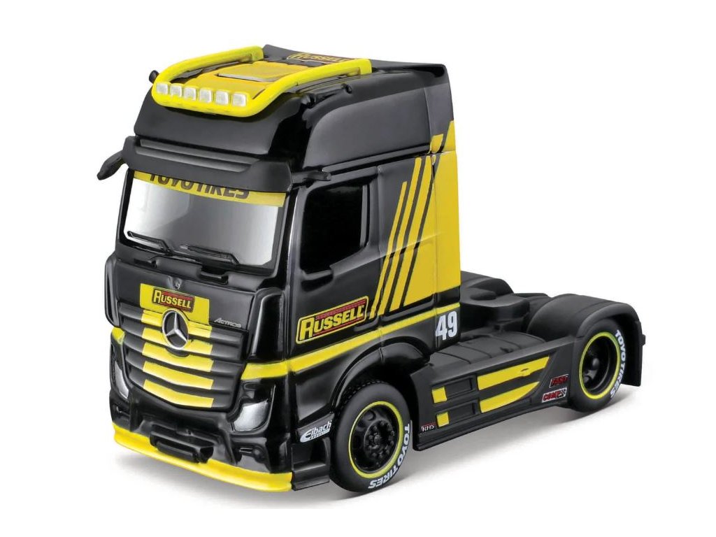 Mercedes-Benz Actros 1851, černo-žlutá. Zcela nové kovové modely tracků s plastovými doplňky. Modely mají gumová kolečka, otevírání přední kapoty, detailní provedení interierů, včetně výrazného barevného provedení, které jim umožňuje vyniknout od ostatních modelů. Balení: 16,45x 8,25x 7,6cm. Věk: 3+