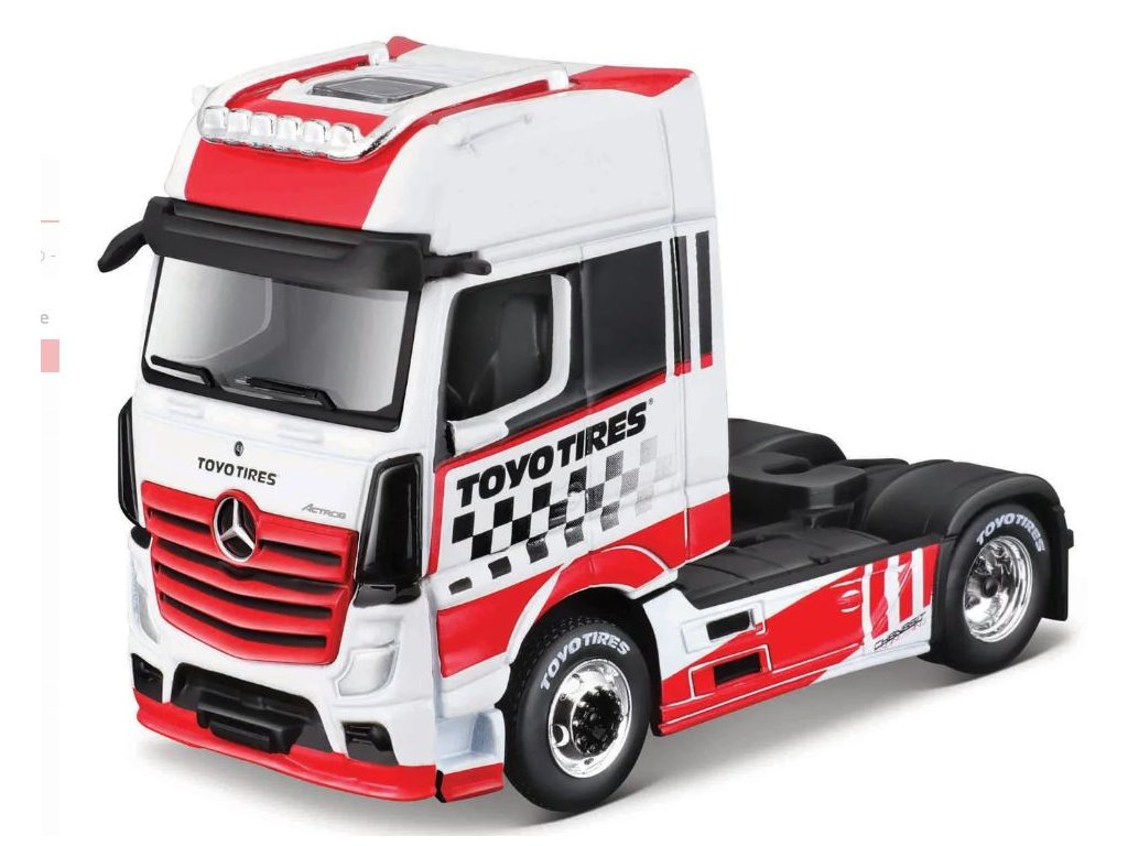 Mercedes-Benz Actros 1851, červeno-bílá. Zcela nové kovové modely tracků s plastovými doplňky. Modely mají gumová kolečka, otevírání přední kapoty, detailní provedení interierů, včetně výrazného barevného provedení, které jim umožňuje vyniknout od ostatních modelů. Balení: 16,45x 8,25x 7,6cm. Věk: 3+