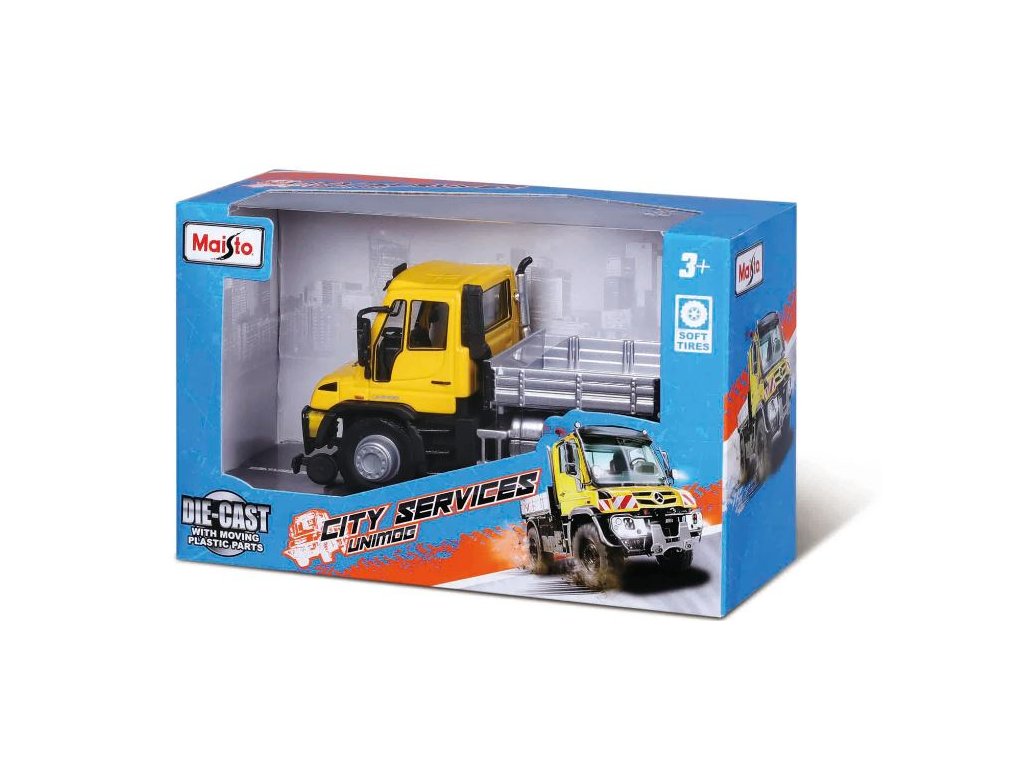 Unimog City Servise. Kovové modely pracovních strojů Unimog s plastovýmí dopňky - pohyblivé části. Varianty k dispozici: Construction Truck, Road Rail Carrier, Road Sweeper, Dump Truck. Baleno v krabičce. Nevhodné pro děti do 3 let. Assort je náhodný mix modelů. Výběr nelze ovlivnit. Věk: 3+
