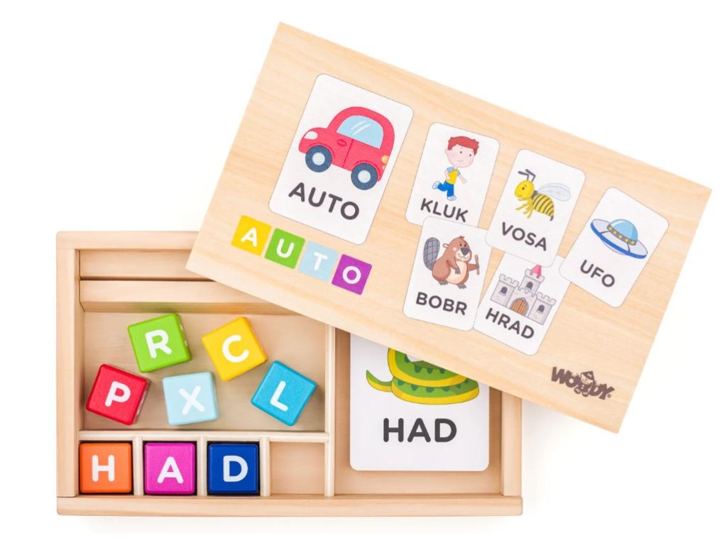 Tato hra patří mezi první formy smysluplného poznávání písmen a skládání slov. Dítě si vybere obrázek s krátkým názvem a zasune ho do stojánku. Na barevných kostičkách se pak snaží najít jednotlivá písmena a správně je poskládat. Hračka je dílem českého výtvarníka.| Rozměr výrobku: 23 x 14 x 3,9 cm