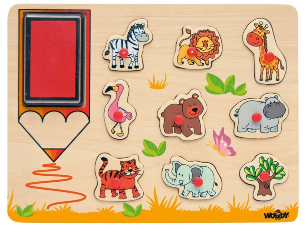 Kombinace razítek a puzzlí. Na spodní straně každého zvířátka je gumové tiskátko, pro které najdete přímo na ploše tohoto výrobku barevný polštářek. Děti si mohou vybarvovat natištěná zvířátka a skládat z nich celé obrázkové kompozice. Rozměr: 30 x 21 cm. Balení obsahuje 10ks. Věk: 3+ Certifikát: Safe Toys