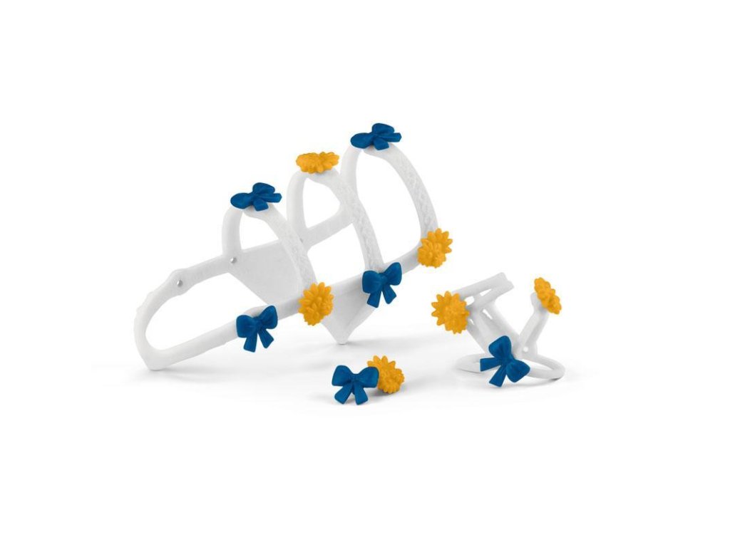 Dekorační doplňky koňských show Schleich® Horse Club přicházejí v oblíbených barvách Tori – modré a žluté! Mašle a květiny mohou být připevněny k uzdě a postroji, jak chcete, takže Toriho kůň má vždy nový svěží vzhled. Čím hezčí a individuálnější je jeho dekorace a ozdoba, tím více bodů ji porota dá na velké přehlídce koní v Lakeside. Sada obsahuje: 1x uzda, 1x postroj, 6x ozdobné mašle, 6x ozdobné květiny. Figurky Schleich® jsou modelovány do nejjemnějších detailů, aby pomohly dětem učit se během hraní.