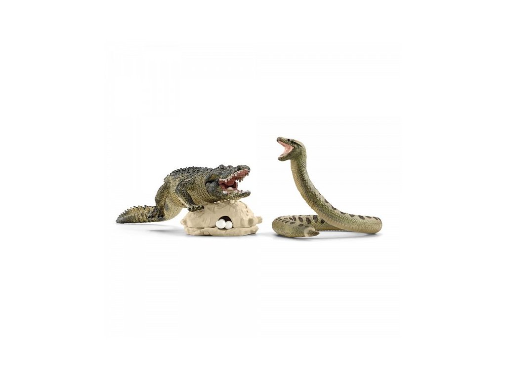 Opatrně! Pokud se vydáváš na průzkum bažin Schleich® WILD LIFE musíš si dávat opravdu dobrý pozor, kam šlapeš. Jinak si nejen ušpiníš ponožky, ale možná tě do prstu kousne had nebo aligátor. Obvykle jsou docela klidní, ale když spí příliš dlouho, mají spoustu přebytečné energie, což znamená, že potřebují vypustit páru. A právě tehdy se had snaží ukrást vejce z hnízda a sníst je za syrova. Ale aligátor má vejce raději smažená! Kdo podle tebe vyhraje? A co kdybys vajíčka vzal třeba ty a běžel s nimi do kuchyně? Rozměry: 19 x 15 x 6 cm. Věk: 3+