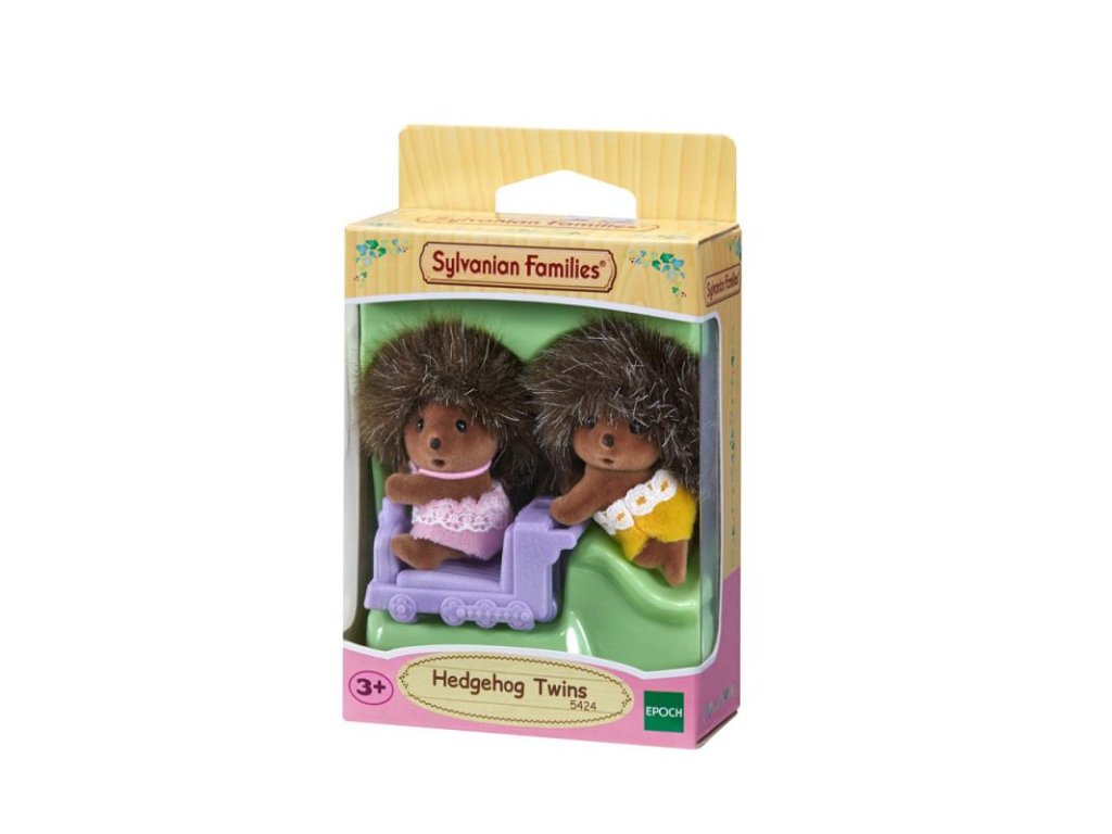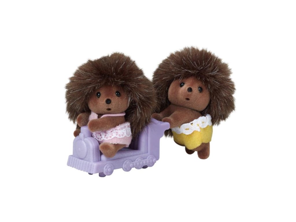 Dvojčata ježků si rádi hrají se svou fialovou mašinkou. Sedící ježek se pohodlně vejde dovnitř mašinky a plazící se ježek jej ručičkama tlačí. Chlapeček při jízdě v kočárku nerad jen sedí, a tak se neustále vyklání ven. Maminka mu vyrobila slaměný klobouček, který si velmi zamiloval. Plazící se holčička je vždy veselá a mává všem lidem, které na procházce potká. Herní sady a figurky Sylvanian Families jsou nadčasové a vysoce kvalitní hračky. Hra podněcuje představivost dítěte. Figurky jsou vyrobeny z plastu, který je potažený jemňounkým sametem. Očička jsou z černých korálků. Všechny končetiny jsou pohyblivé a hlavička otáčecí. Oblečení je vyrobeno tak, aby se dalo opakovaně svlékat a oblékat. Výška dětí je 6,5 cm. Sada obsahuje: 2 baby figurky ježků, 1x mašinka. Věk: 3+