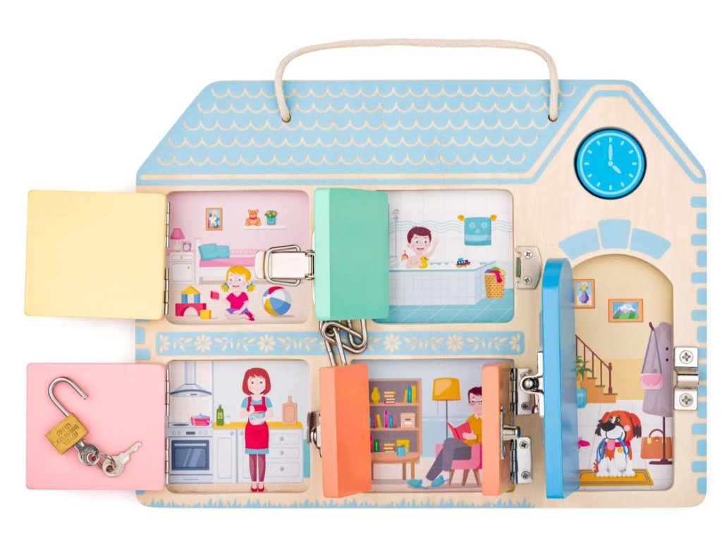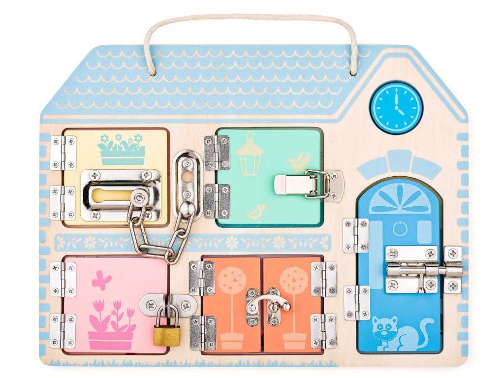 Tréninkem zavírání a odemykání různého typu zámečků trénuje dítě tuto dovednost a zároveň zlepšuje jemnou motoriku. Design českého výtvarníka.| Rozměr výrobku: 30 x 22,5 x3,5 cm | Věk: 3